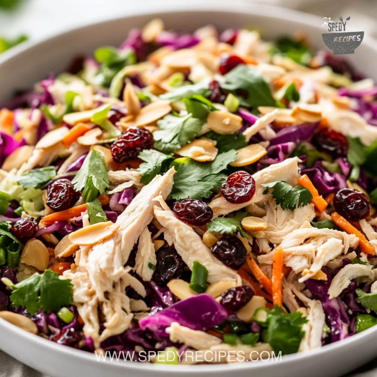 - In a large bowl, combine shredded chicken, cabbage, carrots, dried cranberries, green onions, and cilantro. Toss gently to mix.