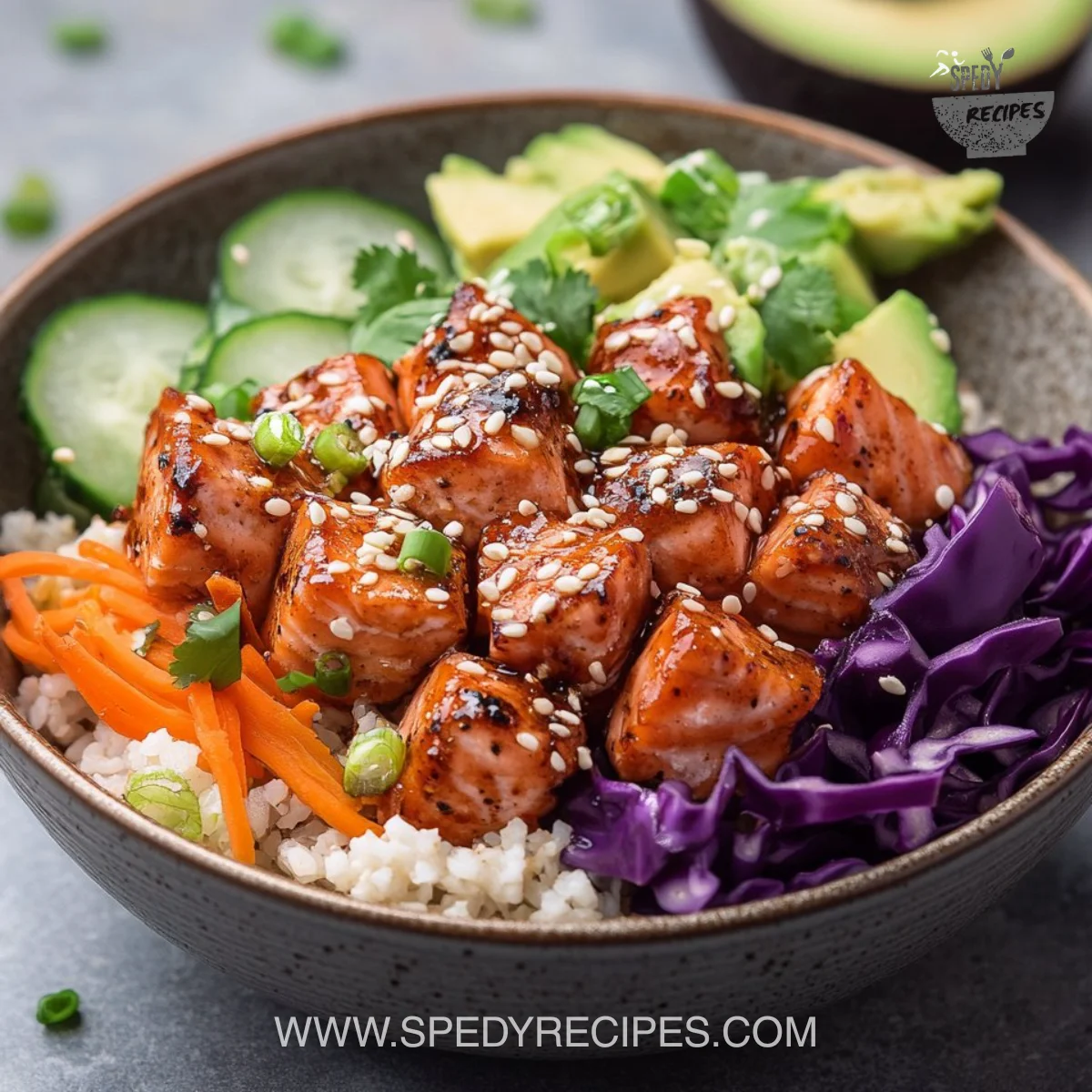 - Spoon jasmine rice into bowls. Add shredded cabbage, carrots, and avocado slices. Nestle the hot salmon bites on top.