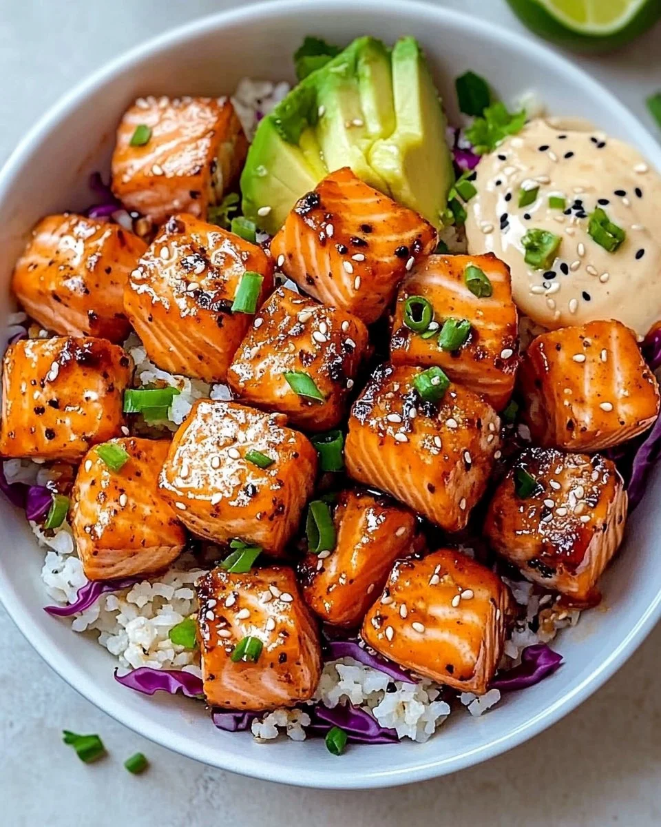 Spoon jasmine rice into bowls. Add shredded cabbage, carrots, and avocado slices. Nestle the hot salmon bites on top. Drizzle with bang bang sauce, sprinkle green onions, cilantro, and sesame seeds. Serve immediately.