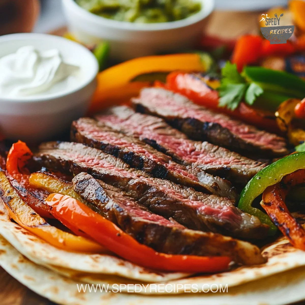 I set everything family-style in the center of the table so the meal feels like a small festival. Place the sliced steak on a platter, pile the peppers and onions beside it, and warm tortillas in a stack wrapped in a towel. Then add bowls of salsa, sour cream, lime wedges, and whatever quick toppings you love.