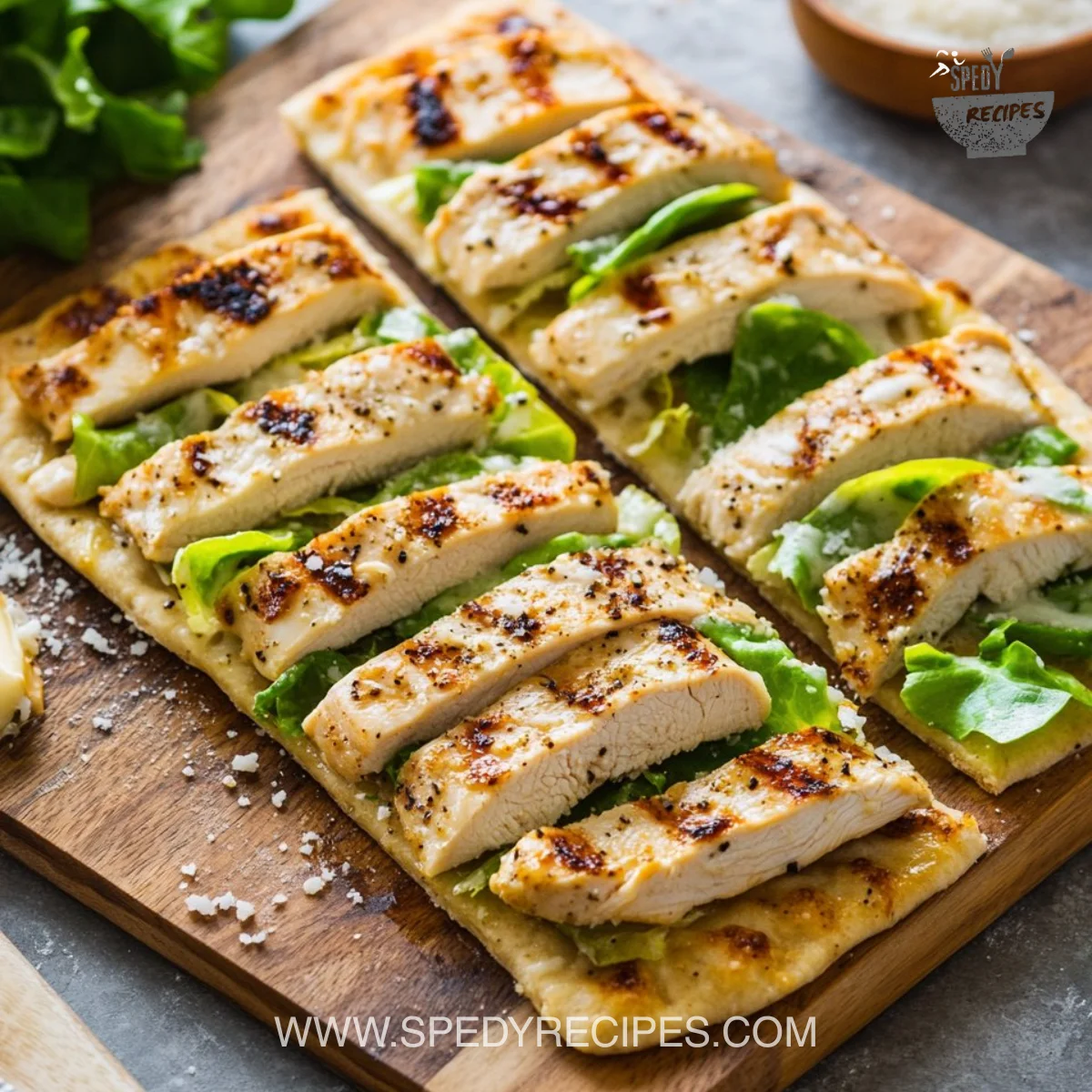 - Layer sliced chicken, chopped romaine, and grated Parmesan cheese on each flatbread.