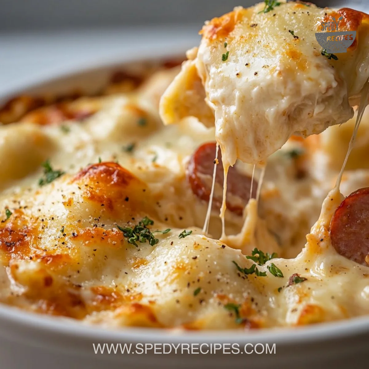 - Stir gently before serving. Fold the casserole slightly so the melted cheese, cream cheese, and broth coat the pierogies and kielbasa. A gentle stir keeps the pierogies intact and distributes flavor.