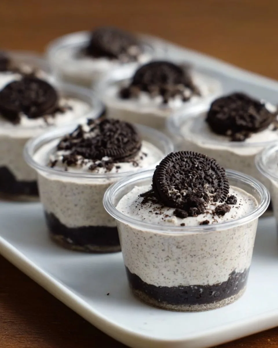 Cookies and Cream Dessert Cups are best served chilled. When ready to serve, simply remove the lids and place them on a platter. You can garnish with extra mini chocolate sandwich cookies or a sprinkle of cookie crumbs for an extra touch!