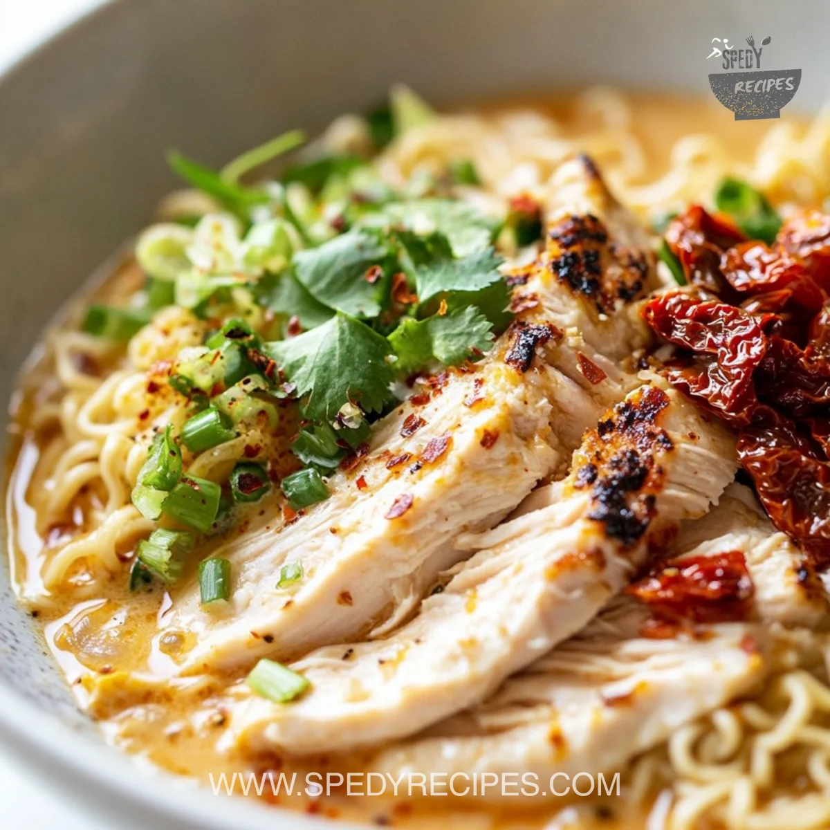 You brown dusted chicken briefly, then build a simple pan sauce with garlic, sun-dried tomatoes, and chicken stock. Stir in cream and parmesan for richness. Toss cooked ramen in the sauce for silky noodles. Finish with fresh cilantro, crunchy bean sprouts, edamame, and a drizzle of chili oil.