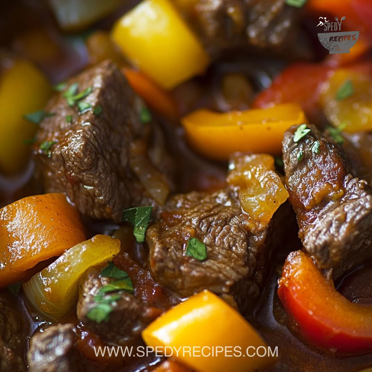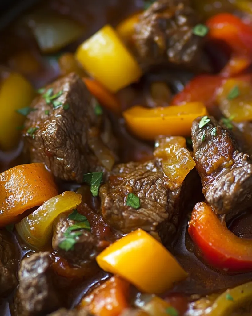 Slow cooking turns tougher cuts of beef into tender, juicy bites without constant attention. The peppers and onions break down and add natural sweetness. Garlic and a concentrated sauce bring depth and a savory finish.