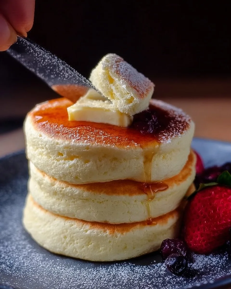- Serve your Fluffy Japanese Soufflé Pancakes stacked high with a sprinkle of powdered sugar on top.