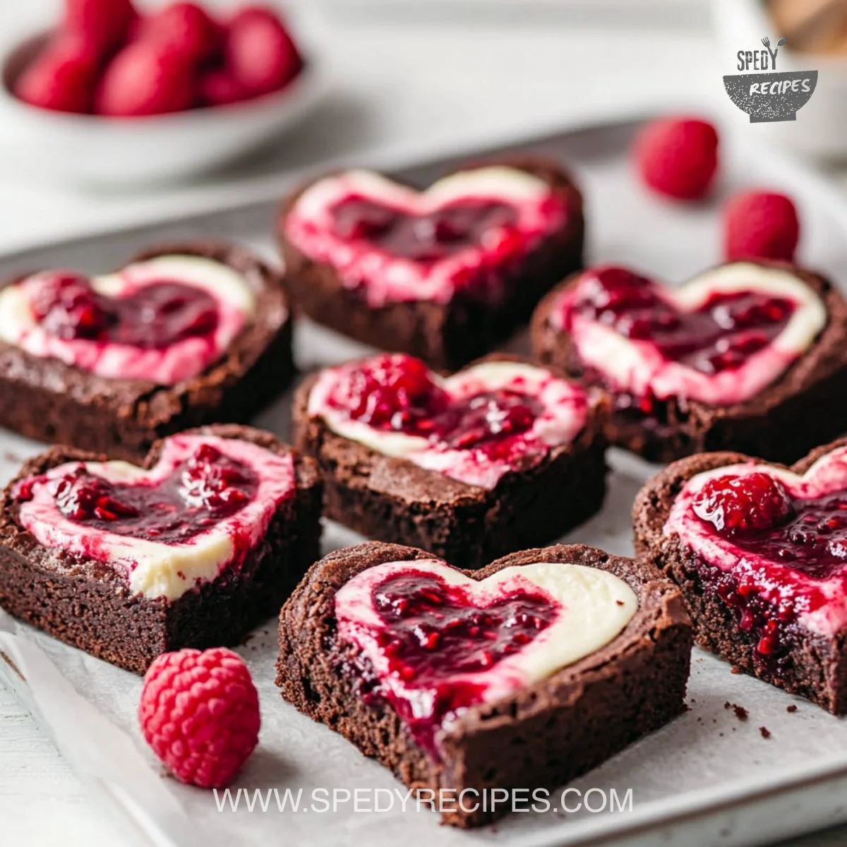 Store leftover brownies in an airtight container in the fridge for up to 4 days. The chill helps keep the cheesecake layer stable and the raspberry ribbon fresh. If you want to freeze them, wrap each heart in plastic and then foil, and freeze for up to 2 months.