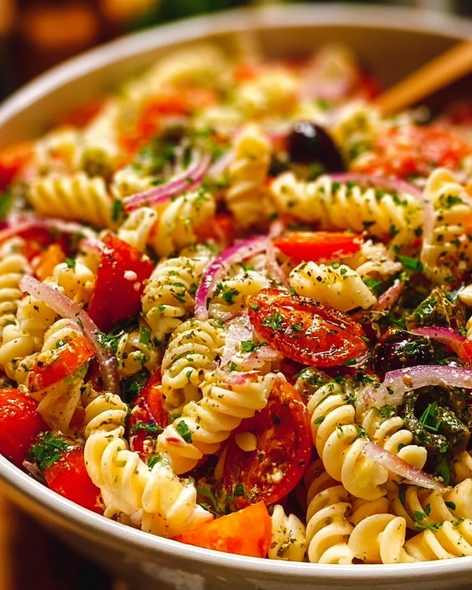 - Garnish with fresh herbs before serving. Enjoy your legendary pasta salad!